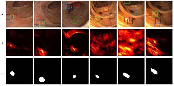 This proposed approach is dedicated to generating attention maps showing the location with the most probable abnormal masses during a colonoscopy procedure, with the purpose of detecting polyps. These attention maps are represented by a Γ𝑡 matrix resulting from the cumulative voting process, projecting a polyp representation table over each frame. Each position in Γ𝑡 represents the probable center of a polyp mass in the intestinal tract. Figure 4 describes typical colonoscopy frames (first row) with their respective attention polyp map (second row) and ground truth (third row). As observed in this Figure, colonoscopy images exhibit significant changes regarding appearance and illumination. Furthermore, the polyps report high variability with regard to shape and appearance, with close similarity to neighborhood intestinal folds. In the attention maps, yellow regions represent locations with a higher probability for the correspondence for polyps. Despite these challenges, the attention map focuses on abnormal masses. As observed, for frames without strong camera movements (first three columns), the computed attention map focuses on polyps, with some probabilities distributed to folds that share appearance and shape features. In the other three columns, strong illumination changes complicate the task of polyp localization, which also happens if the attention maps affect the distribution of localization energy. The Γ𝑡 attention maps were processed to search for regions that maximize the probability and generate alarms of probable polyps, thus supporting the task of localization during colonoscopy. As observed in Figure 4, the maximum regions found in the attention maps are back-projected to colonoscopy frames (color boxes). In descending order of importance, four regions are selected: the green box, the red box, the blue box, and the black box. It is important to note that the extracted regions belong to the polyps to a significant extent, even in attention maps showing noisy voting. In all cases, the polyp is located at one of the detected regions.