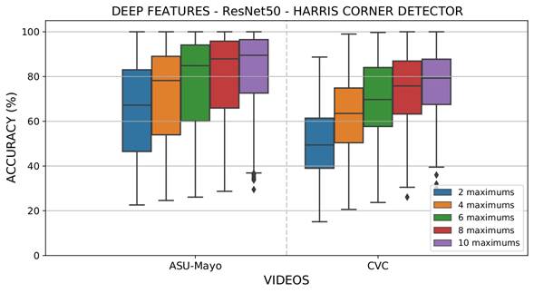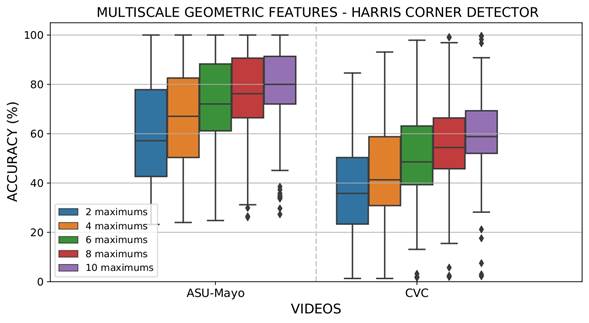 The same experiment was performed on other convolutional architectures, such as Inception-ResNet-V2 and DenseNet. The first one achieved average results of 49% for the ASU-Mayo dataset and 40% for CVC. On the other hand, the DenseNet201 architecture achieved results of 56% for ASU-Mayo and 42% for CVC with the Harris location rule. These results are lower than those obtained by ResNet50. Thus, residual activations achieved a better frame description than other architectures, especially where objects share close characteristics with the background. The same experiment was performed on other convolutional architectures, such as Inception-ResNet-V2 and DenseNet. The first one achieved average results of 49% for the ASU-Mayo dataset and 40% for CVC. On the other hand, the DenseNet201 architecture achieved results of 56% for ASU-Mayo and 42% for CVC with the Harris location rule. These results are lower than those obtained by ResNet50. Thus, residual activations achieved a better frame description than other architectures, especially where objects share close characteristics with the background. To compare the robustness of deep characterization, in this approach, RTables were also built from multiscale geometric features (MGF), defined as orientation gradients (α) , curvature (κ), and color channel intensity (𝑂1) for each pixel 𝑥. In this case, ϕ(𝑥) in the angle (α) is bounded between [-90, 90], the curvature (κ) is between [-1, 1], and the color channel (𝑂1) is the intensity value of each pixel. The cumulative weight ω is defined from the norm of the gradient ||∇𝐼𝑡|| for the angle (α). The Frobenius norm of the Hessian matrix is defined as for the curvature (κ) and set at 1 for the color channel (𝑂1). These parameters were calculated for each pixel at different scales obtained by convolving images with a set of Gaussian filters σ𝑙. In this case, the best configuration was three scales σ𝑙={3,5,7}. Only MGF with a gradient norm greater than zero were considered in the representation. Figure 6 reports the results obtained via MGF for the recovery of the most probable polyp location. As expected, the sparse representation focus on salient points around polyps results in less representative areas for localization and detection during colonoscopy. MGF representation obtained 5 and 13% less than deep feature representation for the ASU-Mayo and CVC datasets, respectively. In this experiment, the Harris corner detector was again the best strategy to extract the most accurate regions from each voting map, reporting approximately 53 and 29% location scores for the ASU-Mayo and CVC datasets. In MGF, each boxplot showed a small variation attributed to low dimensional representation, with only three features, while deep features learned sixty-four activations. Thereupon, having a larger amount of data can lead to higher variance in detection.