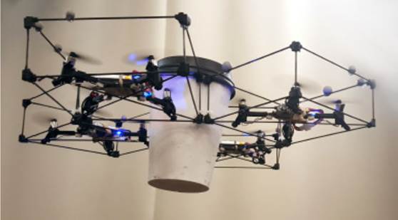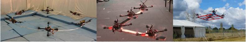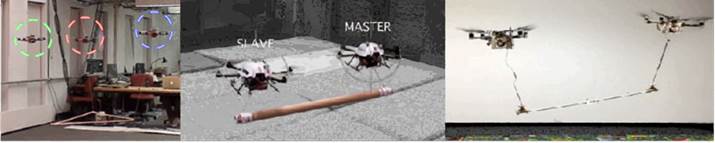 Michael et al. (2011) presentan el control de múltiples UAV en las tareas de manipulación y transporte de una carga por medio de cables; así, se asegura su equilibrio estático en una posición deseada, se analiza su estabilidad y se tienen en cuenta las limitantes de la tensión; un sistema de captura de movimiento es utilizado para estimar la localización de los UAV (figura 11). En Marina et al. (2019), se trabaja un sistema compuesto por cuatro UAV, el cual transporta un objeto suspendido dos veces más pesado que la máxima carga para cada uno de los UAV; se emplea un sistema de captura de movimiento, para obtener la localización de los UAV. Por su parte, Masone et al. (2016) plantean utilizar cables para transportar carga con los UAV, en lugar de dotarlos con manipuladores; además de proveer mayor libertad al equipo de UAV; se emplea un algoritmo de distribución de tensión, el cual permite relacionar el movimiento de los UAV con el de la carga; finalmente, la fase de experimentación es llevada a cabo con ocho UAV.