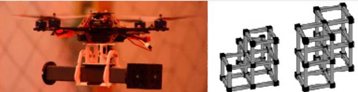 En los trabajos propuestos en Lindsey et al (2011), y Lindsey y Kumar (2013),se construyen estructuras de tipo celosía con un equipo de cuadricópteros. Estas estructuras son livianas, cuentan con partes estandarizadas y se aseguran entre ellas por medio magnético (figura 3); los UAV cuentan con pinzas para levantar, transportar y ensamblar los elementos de la estructura; y se emplea un sistema de seguimiento de movimiento para estimar el estado del UAV, así como para estimar la posición y orientación de los contenedores de las piezas. El ensamblaje de la estructura depende de información local, más no global, de su estado; además, es posible construir distintas configuraciones de la celosía.