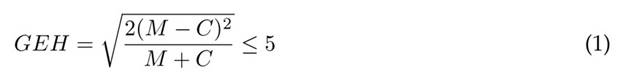 Se inició con la simulación del estado actual del tramo de estudio para contar con un modelo de partida confiable en el software VISSIM (PTV AG, 2015) que se ajustara a los datos recopilados en campo (p. ej., volúmenes y velocidades) y las observaciones de las visitas al sitio (p. ej., puntos de congestión y longitud de colas). En el software se ingresaron las condiciones geométricas y los volúmenes vehiculares contabilizados. El ajuste o calibración del modelo se realizaron bajo la metodología expuesta por Casares, A. y Galarraga, 2015, mediante un comparativo de los valores arrojados por la microsimulación con los medidos en las vías. La calibración se llevó a cabo tanto con los datos de volúmenes vehiculares como con las velocidades para las entradas y salidas de las cuatro intersecciones. La comparación de estos volúmenes se ejecutó mediante el estadístico utilizado en los estudios de tráfico (Rincón-Numpaque et al., 2020), denominado factor GEH Geoffrey E. Havers, ecuación (1)). Si al menos el 85 % de los valores GEH se encuentran por debajo de 5, el modelo se considera calibrado en cuanto a volúmenes. El valor de GEH se evalúa mediante la ecuación (1):