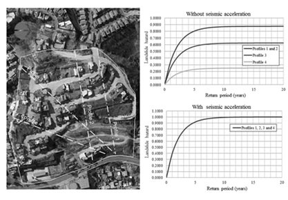Under static conditions (without ground acceleration), the landslide hazard in profiles 1, 2, and 3 for return periods of 5, 10, 15, and 20 years is greater than 0.50, thus falling in the high and very high categories (Figure 11). In a return period equal to the mean recurrence interval that characterizes the area where the neighborhood is located (T = RI = 2), the hazard in profiles 1 and 2 is 0.55 (high), in profile 3 it is 0.39 (moderate) and in profile 4 it is 0.15 (low). In seismic conditions, with ground accelerations close to 0.30g, the hazard is very high throughout the study area for any return period. In these cases, large landslides will surely occur.