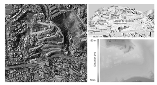 The study area encompasses the Laderas de Monterrey neighborhood (32 ° 30’25.29 "N 117 ° 1’27.23"W), located in the center of the Tijuana urban area. The urbanized area of the neighborhood occupies an area of approximately 62,000 m2 and was built in the 1990s on land characterized by its irregular topography. The neighborhood’s buildings are individual homes averaging two levels in height and more than 150 m2 of the living area each. On May 3rd of 2010, a landslide occurred in this neighborhood destroying a total of eleven homes and causing significant damage to another eight. In addition, the road network and public services were seriously affected by the destruction of three streets and damage to the drinking water, electricity, and drainage networks (Figure 2).