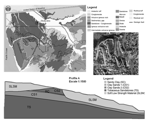 At the base of the hillside, there is the typical lithology of the Otay Geological Formation, made up of medium-grained and light-gray color tobaceous sandstones; while in the upper part of the outcrop, the lithology is that of the San Diego Geological Formation, which is characterized by clayey sands with intercalations of boulders, gravel, and thin layers of clay. Recent geotechnical and geophysical studies indicate the presence of significant amounts of soft, low-strength materials, products of the collapse and removal of the natural terrain due to the landslide in 2010 and as a result of the deterioration of the surface soils and fillings due to weathering (Figure 4).