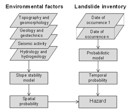 In general, a hazard is a potentially harmful physical event or human activity that can cause loss of life, property damage, economic and social disruption, and environmental degradation (UN-ISDR, 2004). In the case of landslides, the event has a certain probability of occurrence within a specific period of time, in an established area, and with a determined intensity (Van Westen et al., 2011). This probability can be calculated using the following equation (Guzzetti et al., 2006):