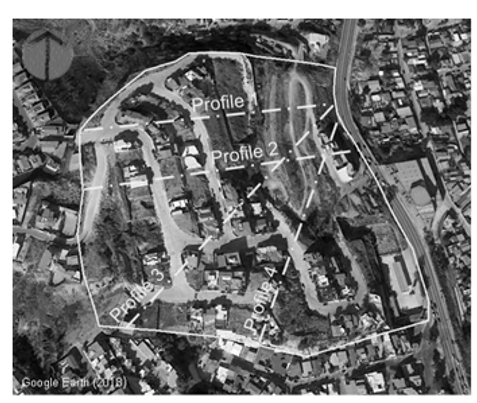 The spatial probability was analyzed from the concept of susceptibility to landslides and was calculated using slope stability analysis methods, through which potential landslide surfaces and their corresponding factors of safety were obtained. The stability analyses were carried out in four profiles of the study area (Figure 6), which were selected considering the geometry of the terrain surface, the presence of groundwater flows and anomalies in the subsoil, as well as the geotechnical and structural pathologies associated with processes of terrain instability.