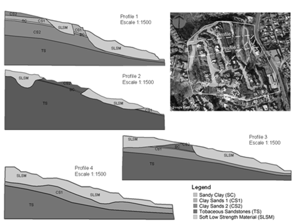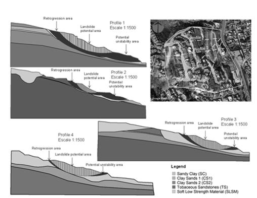 Based on the results of the studies and available data, the geological-geotechnical models were elaborated to determine the susceptibility of the land to landslides in the selected profiles (Figure 8).