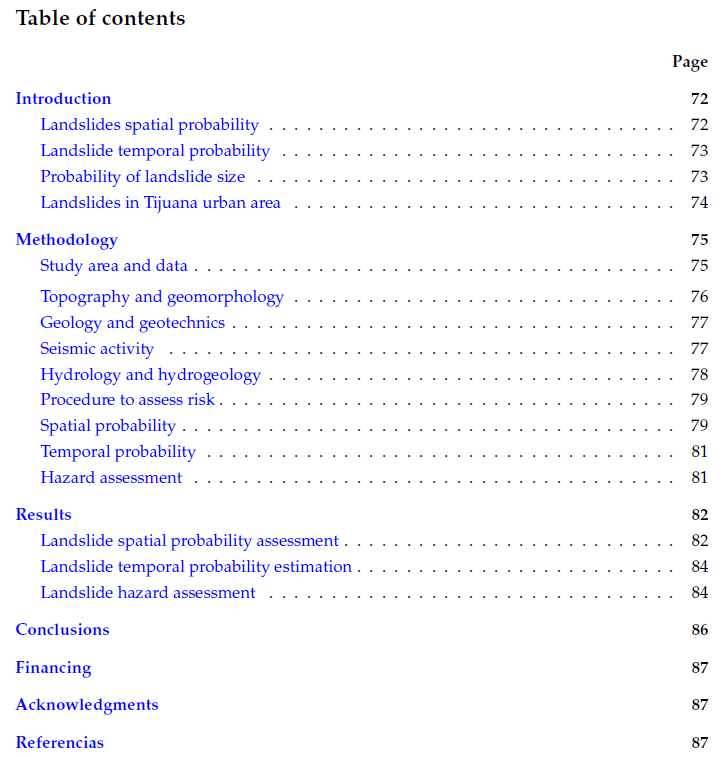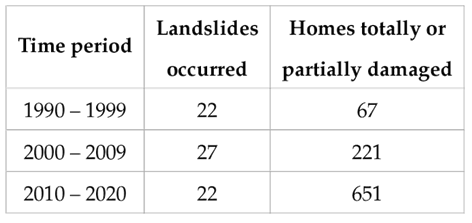 From 1990 to September 2020, more than seventy landslides have been registered in the urban area of Tijuana. These incidents have resulted in the complete or partial destruction of over a thousand buildings, mainly homes, along with extensive damage to essential infrastructure such as road networks, electricity, drinking water, and drainage (Table 1).