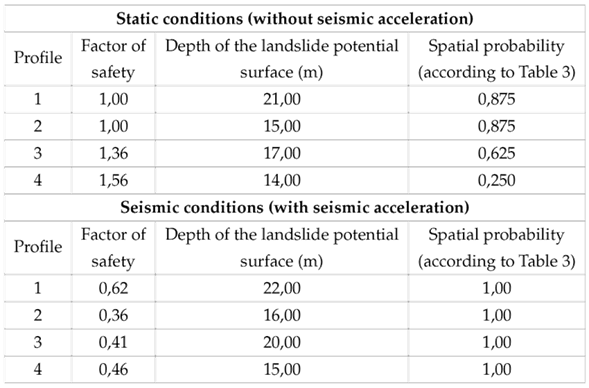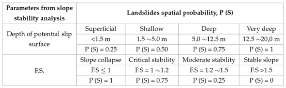 The relationships used to estimate the spatial probability from the depth of the potential slip surface and its corresponding factor of safety (F.S) are presented in Table 3.