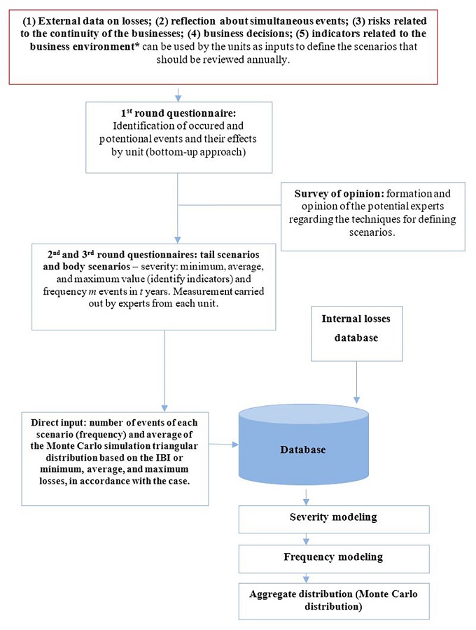 This study contributes to the topic by proposing a methodology that is easily understood by business unit experts in order to obtain scenarios. To propose the methodology, some assumptions were extracted from the studies chosen, such as: (i) the use of distributions with easily understood parameters, such as the Poisson distribution and triangular distribution (Folpmers, 2008); (ii) the use of information such as direct input in the LDA methodology (Aue & Kalkbrener, 2007; Momen et al., 2012).