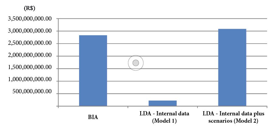Figure 2 compares the minimum capital values required for BNDES’s operational risk via the BIA approach (base date December/2015) and via the LDA methodology, using only the data on internal losses (Model 1) and using the data on internal losses and the scenarios measured in accordance with the methodology proposed in this study (Model 2).