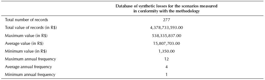 After the measurement, the scenarios formed a synthetic database of losses that was used together with the data on internal losses to calculate the capital, in accordance with the steps indicated by Cruz et al. (2015).