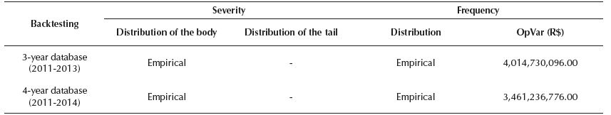 Given that a five-year database was considered and the minimum period of the database for calculating the capital defined by the BC is three years (BC, 2013a), it was possible to carry out the backtesting considering three and four year periods.