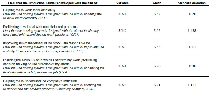 The enabling dimension of the use of management reports is defined in this paper as the perception that the managers have regarding the system designed to facilitate, structure, and conduct their activities, generating more flexibility, autonomy, and understanding of the whole company. The operationalization of this construct is based on Mahama and Cheng (2013), who used the enabling perceptions of cost system construct operationalized by six variables, with a reverse response variable not being used in this study. The original question from Mahama and Cheng (2013) is presented below each statement.