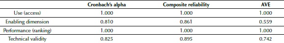 We evaluated the validity and reliability of the construct based on the average variance extracted (AVE). In Table 6, it can be observed that the constructs present adequate convergence, since the coefficients of the AVE are above 0.50 (Fornell & Larcker, 1981; Hair et al., 2009).