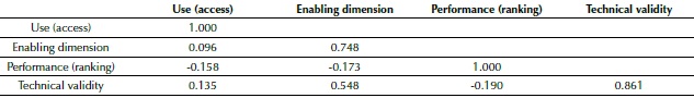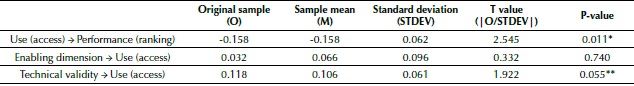 Table 8 presents the coefficient of determination (R2), in which it is observed that the exogenous constructs technical validity and enabling dimension, together, have an explanatory power of approximately 2% in the endogenous construct use (access). In turn, only 2.5% of the variations in performance (ranking) are explained by the previous relationships. From these coefficients, it can be concluded that the structural model has a small effect on the explanation of the endogenous variables (Cohen, 1988).