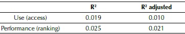 For the purposes of this paper, the performance ranking was used, which has an inverted scale; that is, the lower the number in the ranking, the higher the resulting performance. Therefore, the association between the “use (access)” and “performance (ranking)” constructs will be negative.