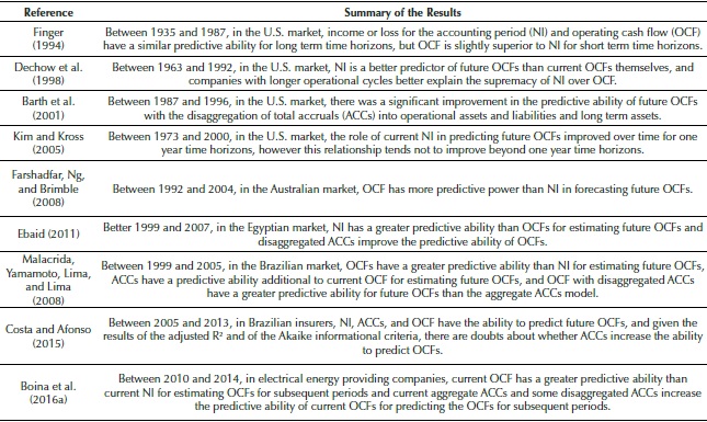 Since one of the aims of accounting, according to Watts and Zimmerman (1986), is to predict accounting practices and their effects, various studies have been developed regarding the predictive ability of accounting variables. Among these, those that have aimed to predict future cash flows stand out. Table 1 summarizes information on some of the main international and Brazilian studies developed in relation to the theme of the predictive ability of accounting variables.