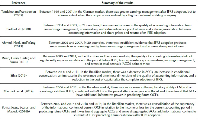 Different studies, highlighted in Table 2, have sought to investigate the impacts of the changes derived from the accounting convergence with IFRS. However, there is no consensus regarding the effects, with some studies not showing any significant impact and others indicating improvements in the quality of accounting information (Costa & Afonso, 2015).