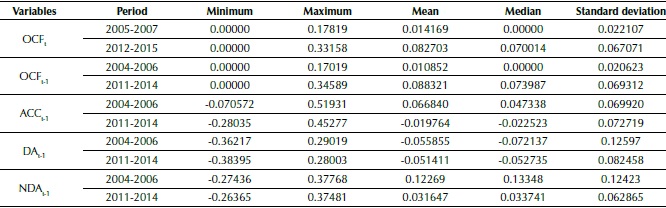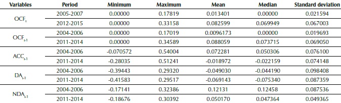 The values of the dependent variables are in t and those of the independent variables are in t-1, with there being two periods: before (2004-2007) and after (2011-2015) IFRS. Influenced by Barth et al. (2001), it is noted that the values of the dependent and independent variables were adjusted by the mean of total assets between the start and the end of the period analyzed.