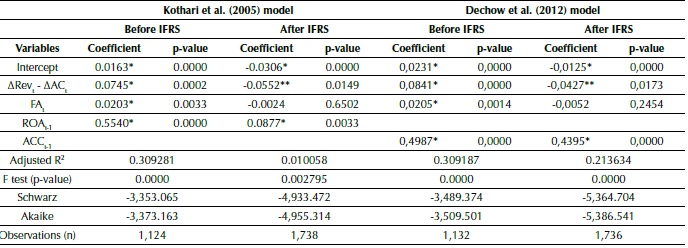 Statistical summaries of the ACC estimation models (Dechow et al., 2012; Kothari et al., 2005) are presented in Table 5. It was verified that before and after the employment of IFRS, the variables (except fixed assets after IFRS adoption) and the analyzed models themselves were statistically significant at a level of 5%.