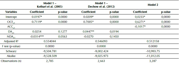 In addition, the adjusted R2 of the Kothari et al. (2005) and Dechow et al. (2012) models 1 were higher than that of model 2, indicating the non-rejection of H1 of this study, despite the values of the Akaike and Schwarz informational criteria of model 2 being lower than those of models 1.
