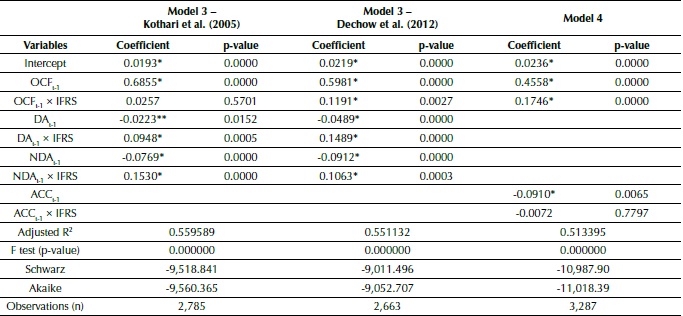 Using the Chow test, in order to examine whether the intercept or the angular coefficients of the regression remained statistically stable after convergence with IFRS in Brazil, rejection of the null hypothesis was verified, given that the p-values of the Kothari et al. (2005) and Dechow et al. (2012) models 3, as well as model 4, were equal to 0.0000. So, there was a structural break; that is, the parameters presented statistical instability of the sample before to the sample after IFRS adoption, which reinforces the indication that the accounting variables were positively impacted by IFRS adoption in Brazil.