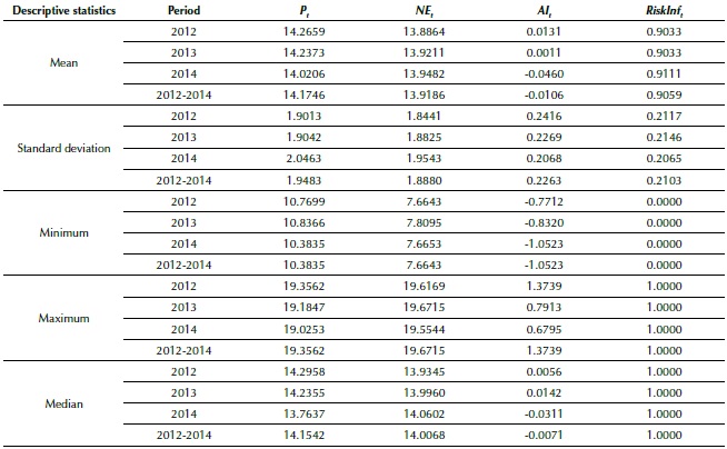 Based on Table 1, it is perceived that the means for the value of the companies and the abnormal income reduced in the period, perhaps due to the effects of the economic recession and low optimism in the market. In contrast, the average net equity increased. The disclosure of risk factors was shown to be satisfactory in the sample. Regarding risk management, 71 observations had information about the existence of this specific administrative body in the firms, representing 24% of the total. The firms with risk management have better results for the disclosure of risk factors (mean: 0.9390 against 0.8957; amplitude: 0.4444 against 1.000; standard deviation: 0.1185 against 0.2307), which may signal the impact of risk management on disclosure. As a dichotomous variable is concerned, risk management was not included in the descriptive analysis.