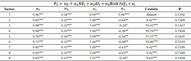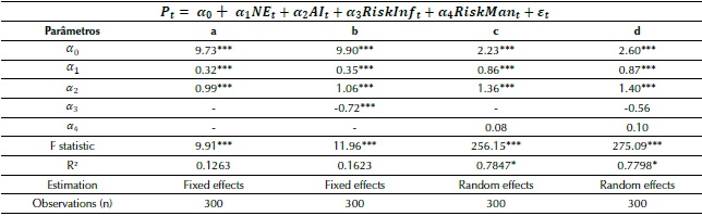in which P t is the natural logarithm of the market value of the firms (see Economatica®), NE t is the natural logarithm of net equity (see financial statements), AI t is the abnormal income calculated in accordance with equation 2, scaled by NE t-1 , with the proxy for the risk free interest rate being the Special Settlement and Custody System (Selic) suggested by Lopes et al. (2007) and applied in Madeira and Costa (2015), RiskInf t is the index of the volume of disclosure of risk factors, and RiskMan t is the disclosure of the existence of a risk management entity, with a dummy with 1 for its existence and 0 otherwise.