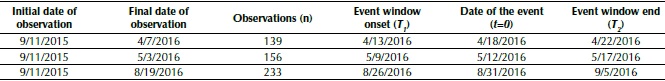 In order to establish the event window, as observed in Figure 1, it is found that t=0 is the event date and from t=T0 + 1 to t=T1 is the estimation window. Then, L1 = T1 - T 0 and L2=T2 - T1 are the size of the estimation window and the event window, respectively. The post-event window will be the size of L 3 = T3 - T 2