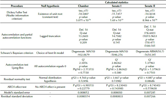 where y t y t , in this paper, is the IBOVESPA return on date t; ε t−1 is random disturbance at time t and it has a distribution ε t ∼N(0,σ²), a 0 is a constant, a i , i=1,2,…,p, is the parameter of the autoregressive part in the model, and β i , i=1,2,…,q, is the parameter of the moving average (MA) part process in the model. It is worth remembering that an AR (p) is a special case of an ARMA (p, 0) and a MA (q) may be represented by an ARMA (0, q). In addition, models may or may not have all of their complete lags; when this occurs, they are called ‘degenerate.’ Another point that must be ratified is that each event t = 0 of the Chamber, Senate I, and Senate II had its own estimated model, just as if based on the information available to the players so far. Thus, there are three models.