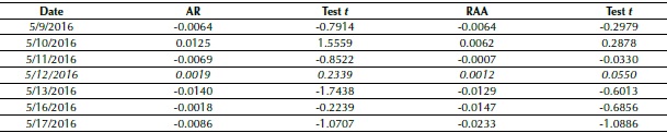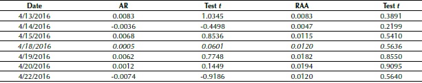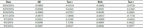 In the same direction as Camargos and Romero (2006), herein the EMH test uses the Student’s t-test at a 5% (p value < 0.05) significance level. The null hypothesis H0 is rejected when the p value calculated is lower than the significance level α, something which allows us to conclude that the RAA is different from 0, otherwise it would be 0.