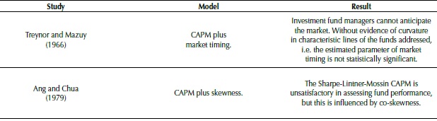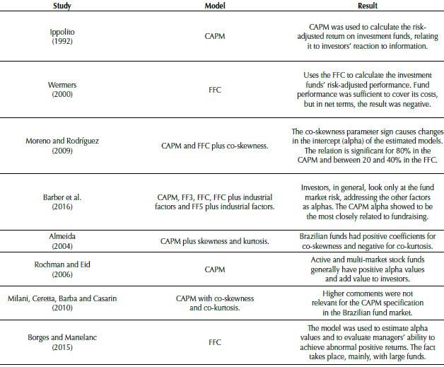 Barber et al. (2016) related risk factors to mutual fund’s fundraising, in an attempt to establish the most adequate performance measurement for predicting funds’ resource flows. The models used by the authors were: market-adjusted returns, CAPM, FF3, FFC, 7 factors, which includes 3 industrial variables, and 9 factors, which also aggregates profitability and investment. The study results showed that the CAPM alpha value is the best measure to estimate fundraising, and that market risk (beta) is the most frequently considered by investors when evaluating funds. Table 1 summarizes the results of studies using risk factors and higher funds’ comoments.