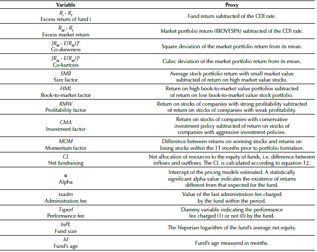 Data that serve as inputs to the analyzes proposed by this study are the monthly fund returns. From the latter, the risk-free rate (Brazilian interbank deposit certificate - CDI) was subtracted to calculate excess returns (R i - R f ), a dependent variable in the pricing models. The market premium (R M - R f ) was constituted through IBOVESPA returns. Co-skewness and co-kurtosis proxies were also used in the models.