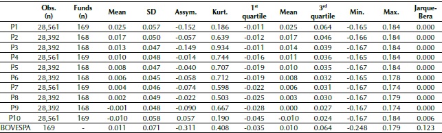 For data analysis, the funds were separated - after eliminating outliers through equation 11, according to Carhart (1997) -, in terms of their returns: from the most profitable (P1) to the least profitable (P10), allowing a risk-adjusted performance check based on returns. We maintained in the sample funds that showed at least 12 months of returns, so that their variability could be evaluated for a certain period, avoiding survival bias.
