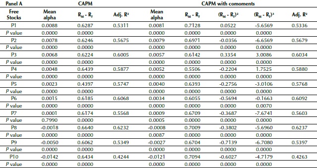It is observed that the portfolios with the 2 lowest returns (P9 and P10) had negative average results, while only the 3 largest ones (P1, P2, and P3) surpassed the IBOVESPA within the period. In terms of standard deviation, the funds do not seem to be riskier than the index, something which demonstrates the diversification effect on risk reduction. The portfolios showed positive and negative asymmetry and excess of kurtosis, facts that make relevant investigating the existence of premiums for these two statistical moments. The normality hypothesis of the returns was rejected in all fund portfolios, but not for the IBOVESPA (p value of the Jarque-Bera test).