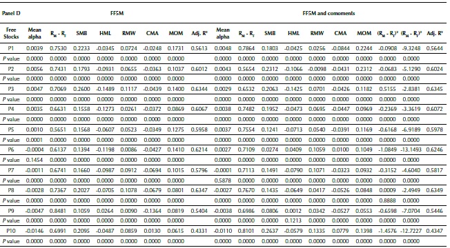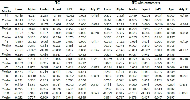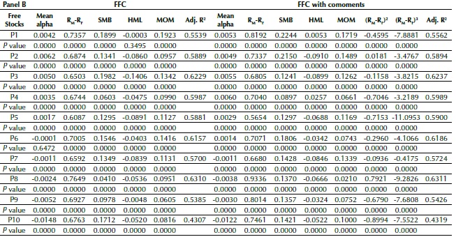 Carhart (1997) and Fama and French (1993) developed a pricing model that, according to the authors, explains the anomalies not covered by CAPM. The FFC results are reported in Panel B in Table 4. For the Free Stock funds, the alpha values of FFC are lower, in absolute terms, than those of CAPM, indicating that a part of what was regarded as abnormal return in CAPM is actually due to the factors size (SMB), value (HML), and momentum (MOM), as already described by Carhart (1997). The alpha value of P6 lost significance in relation to the CAPM, while that of P7 gained it. The inclusion of the comoments did not result in changes in the alpha value significance (except for P6), demonstrating that co-skewness and co-kurtosis are not relevant to explain fund performance. The other factors are not impacted by the comoments, except the HML of P1.