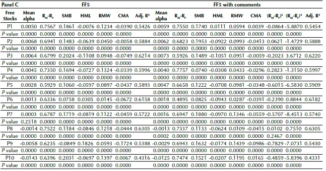 Panel C in Table 4 shows the results of estimates for the FF5 model, which has the profitability and investment factors. It is noticed that the alpha values of funds were also significant when estimated through FF5 and their reduction was lower than that of FFC, when compared to alpha values of CAPM. Moreover, the increase in adjusted R2 is also lower, except for the percentile of losing funds (P9 and P10), which have such a coefficient higher than that of FFC. It is noticed, just as in Chiah et al. (2016), that HML did not lose significance with the presence of RMW and CMA. The terms co-skewness and co-kurtosis were significant, but they did not cause changes in the other factors.