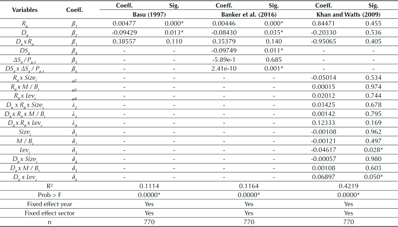 This section presents the description and analysis of the data. Table 2 shows the summary of models 1, 2, and 3, which aim to demonstrate the practice of accounting conservatism adopted by the Brazilian companies analyzed, in accordance with the Basu (1997), Khan and Watts (2009), and Banker et al. (2016) models; in these equations all the companies were analyzed together, without annual weighting, with the aim of only analyzing the conservatism coefficient, and not the relationship sought in the study.