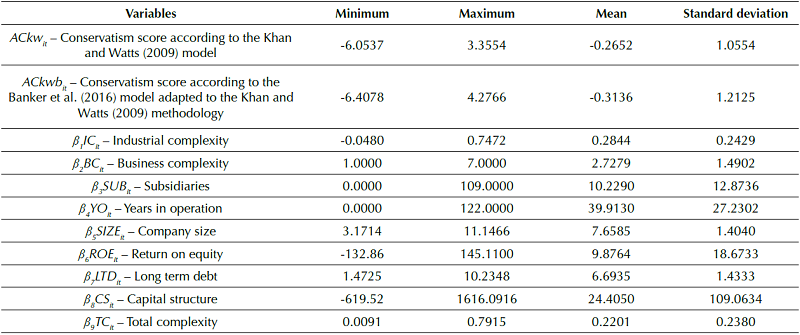 Having observed the estimations of conservatism by the models, Table 3 presents the descriptive statistics of the variables used in the main analysis of the relationship between the complexity and accounting conservatism of each company.