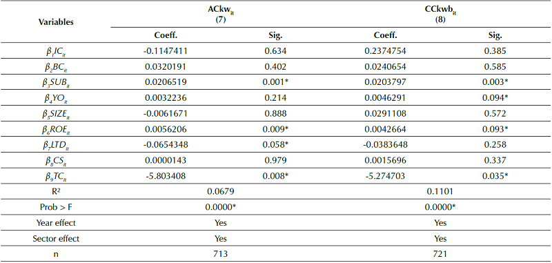 Having carried out the descriptive statistics for the variables, Table 4 presents the summary of equations 7 and 8, which measure the influence of the complexity of the companies on the level of accounting conservatism.
