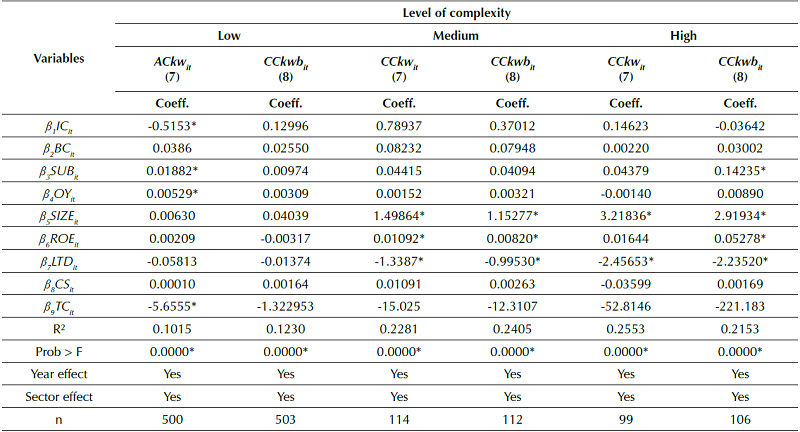 This result for TC may be connected to the fact that highly complex environments, such as when a company presents the three types of complexity, are more common in large corporations, which have more mechanisms for mitigating informational asymmetry, and where accounting conservatism is not necessary or used less intensely for this. Or, also, according to LaFond and Watts (2008), highly complex companies may be adopting conservatism to a lesser degree with the aim of reducing the external market’s perception of asymmetry, seeking to reduce possible political costs resulting from the perception of this practice. However, these aspects were not the object of investigation in this study and could constitute a gap in the research to be explored by future studies.