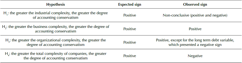 It follows that when a company presents complex activities, the managers may adopt conservatism instead of opportunistic practices, due to internal controls or external pressures to reduce information asymmetry. However, it is worth mentioning that accounting conservatism can be motivated by numerous other causes, such as taxation factors, accounting standards, culture, and manager remuneration, among others. Nonetheless, this study proposes to observe this practice from the perspective of the complexity of the activities of companies.