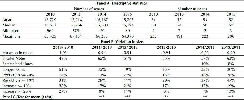 The analysis of Note size before and after OCPC 07 is carried out by taking the Notes of all the non-financial firms listed in the B3 in 2010 (year of IFRS adoption), 2013 (year immediately before OCPC 07 adoption), and 2014 and 2015 (first and second years OCPC 07 was in effect). The year of 2010 is included to distinguish possible variations in Note size associated with the learning curve since IFRS adoption (2013 vs. 2010) from the variations attributable to the adoption of OCPC 07 (2014 vs. 2015 vs. 2013). Two proxies are used for Note size: the number of words and the number of pages.