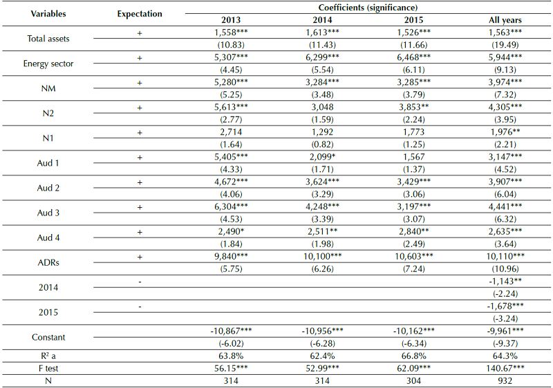 in which SIZE EN is the size of the note, measured by the number of words, SIZE is the size of the company, measured by the Neperian logarithm of its total assets, S_EE is the electrical energy sector, after the bivariate tests indicated that the firms from the electrical energy sector behaved differently from those from the other regulated sectors (this sector was introduced in the regression model as a binary variable: 1 if the company is from the electrical energy sector, and 0 otherwise), GOV is the corporate governance, a listing in one of the special corporate governance segments of the B3 (after the bivariate tests indicated different behavior per level of listing, each special level of listing - N1, N2, and N3 - was tested separately as a binary variable: 1 if the company belongs to each one of the special corporate governance segments, and 0 otherwise), BIG4 is the auditing firm, indicating whether the company is audited by a Big Four firm (after the bivariate tests indicated different behavior for some auditing firms, each one is analyzed separately: 1 if the company is audited by a specific Big Four firm, and 0 otherwise), ADR is the company issuing ADRs on the NYSE, indicating whether the company has ADRs listed on the NYSE or not (1 if the company is an ADR issuer listed on the NYSE, and 0 otherwise), and YEAR is the year, a binary variable inserted to capture the effect of each year OCPC 07 is in effect (1 for each year OCPC 07 is in effect - 2014 or 2015 - and 0 otherwise).