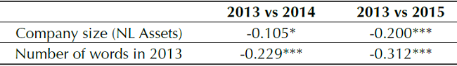 According to Table 6, the similarity of the company’s EN in relation to the auditor’s model note appears to remain constant or fall slightly, from 54.3% in 2013 to 50.9% in 2014 (10% significance), suggesting an almost unperceivable improvement in this indicator. However, 61% of the companies in the subsample achieved some reduction in the similarity index for their note on accounting policies in relation to the auditor’s model note.