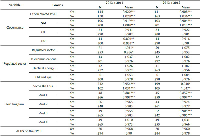 For the analysis, the subsample of 62 companies was limited to only those audited by one of the Big Four and that did not change auditor between 2013 and 2014, totaling a final sample of 44 samples. The analysis is carried out by tests of difference between the means of the similarity indices for 2013 (before OCPC 07) and 2014 (first report under OCPC 07).