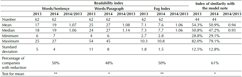 The analysis of the note on accounting policies of the companies that reduced the size of their Notes by at least 20% reveals that the reduction did not result in an improvement in the readability indicators, but there was a small deterioration. These results suggest that, in the process of reducing their Notes, the companies appear to have eliminated entire sentences and/or sentences breaks, neglecting the task of making the sentences more concise and readable. The analysis of the index for the similarity of the text of this note with the template divulged by the auditor indicates that the undesirable practice of copy-pasting had at least a small improvement: the average for the similarity index fell by only 6%, falling from 54.3% literal reproduction of the template in 2013 to 50.9% in 2014, at a level of significance of only 10%. Thus, OCPC 07 appears to have had little effectiveness in facilitating the readability of the Notes and in focusing on the real policies adopted by the company.