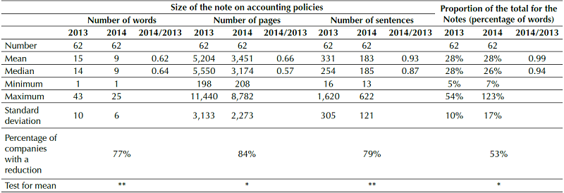 Table 5 presents the indicators of size of the note on accounting policies of the 62 companies whose Notes were reduced by at least 20% in 2014, the year OCPC 07 was introduced. An expressive reduction is observed in the size of the note, of between 34% and 45%, depending on the metric used (number of pages, words, or sentences, all significant at 1%).