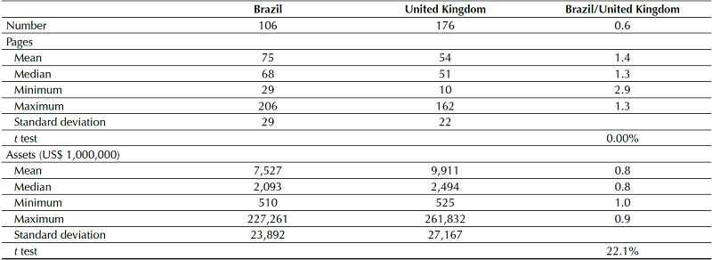 To complement the analysis, for illustrative purposes only, this study compares the size of Brazilian and British Notes in 2015 (after two years of OCPC 07 being in effect). The aim is to verify whether the adjustments in the Notes carried out by the Brazilian companies after OCPC 07 were enough to make their size similar to those of British companies, considered a benchmark for characteristics incentivizing transparency: the common law legal-accounting tradition, a high degree of institutional enforcement, and the economic incentives of a highly developed capital market.